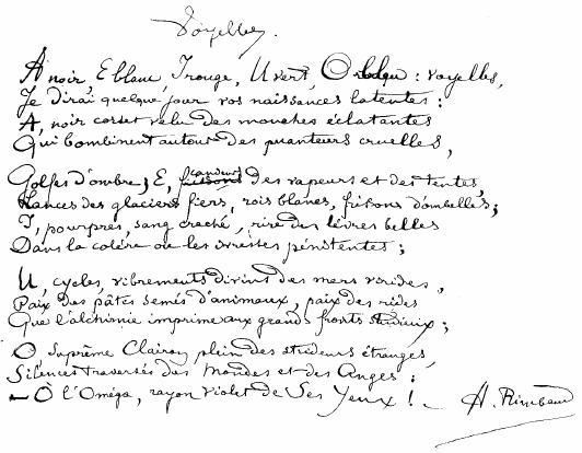 A noir, E blanc, I rouge, U vert, O bleu : voyelles, Je dirai quelque jour vos naissances latentes : A, noir corset velu des mouches éclatantes Qui bombinent autour des puanteurs cruelles, | |